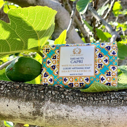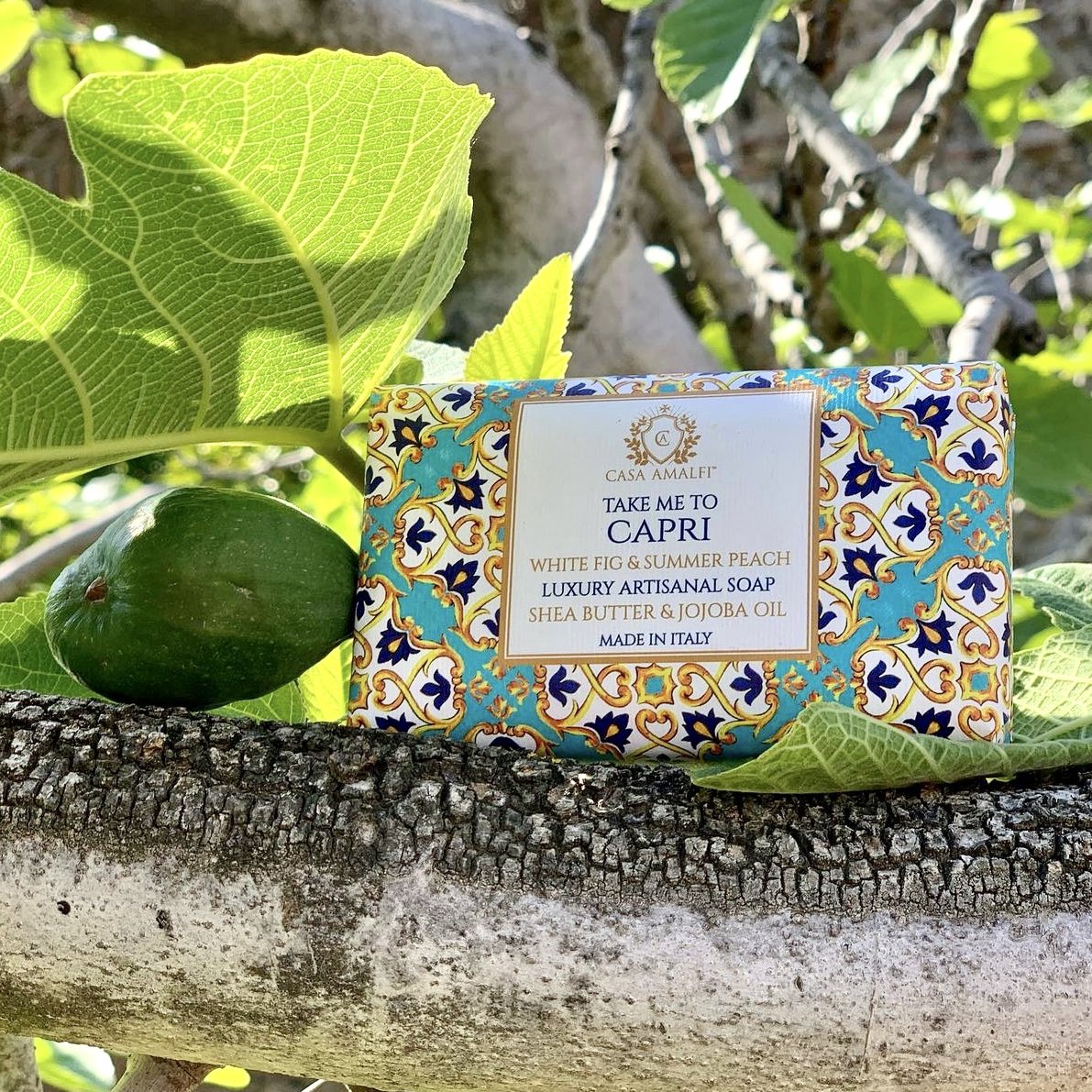 dagli artigiani sulla Costiera Amalfitana e il nostro Sapone Astucciato Take Me to Capri. Con la fresca essenza di foglie di fico e edera, coccola la tua pelle evocando la magia dell'isola più accattivante d'Italia.